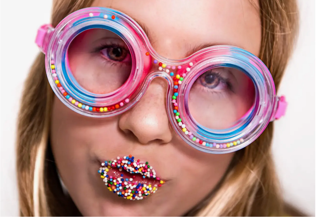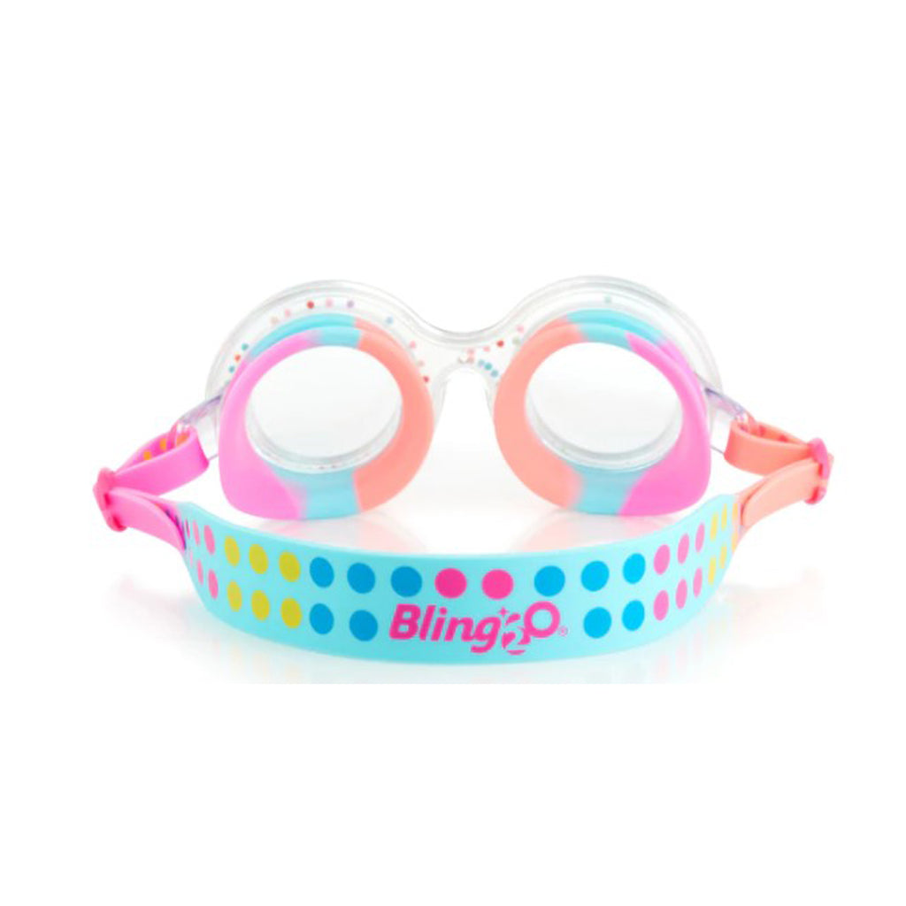 Bubble Yum for Double the Fun! Yummy Gummy features a double layered frame with free falling 3 dimensional faux sprinkles and is finished with a gum ball printed strap. The flavor never fades in Bling2o's Bubble-icious swim goggle.