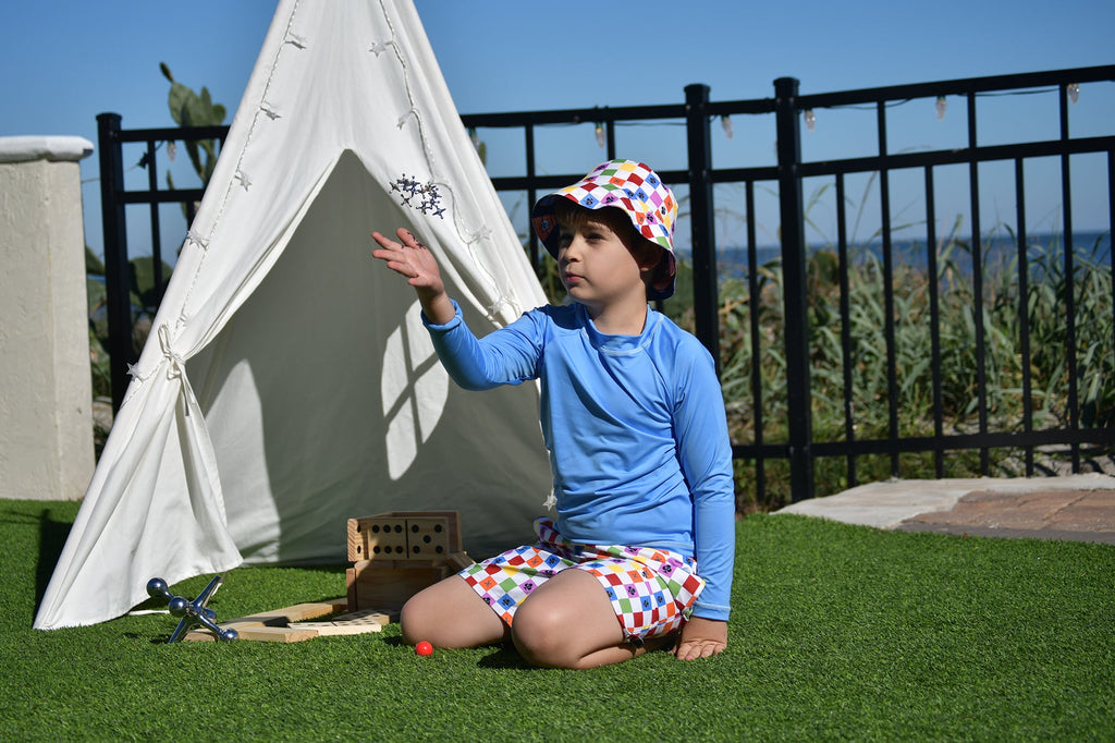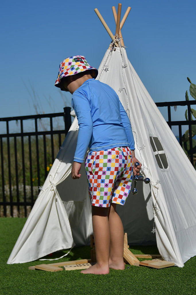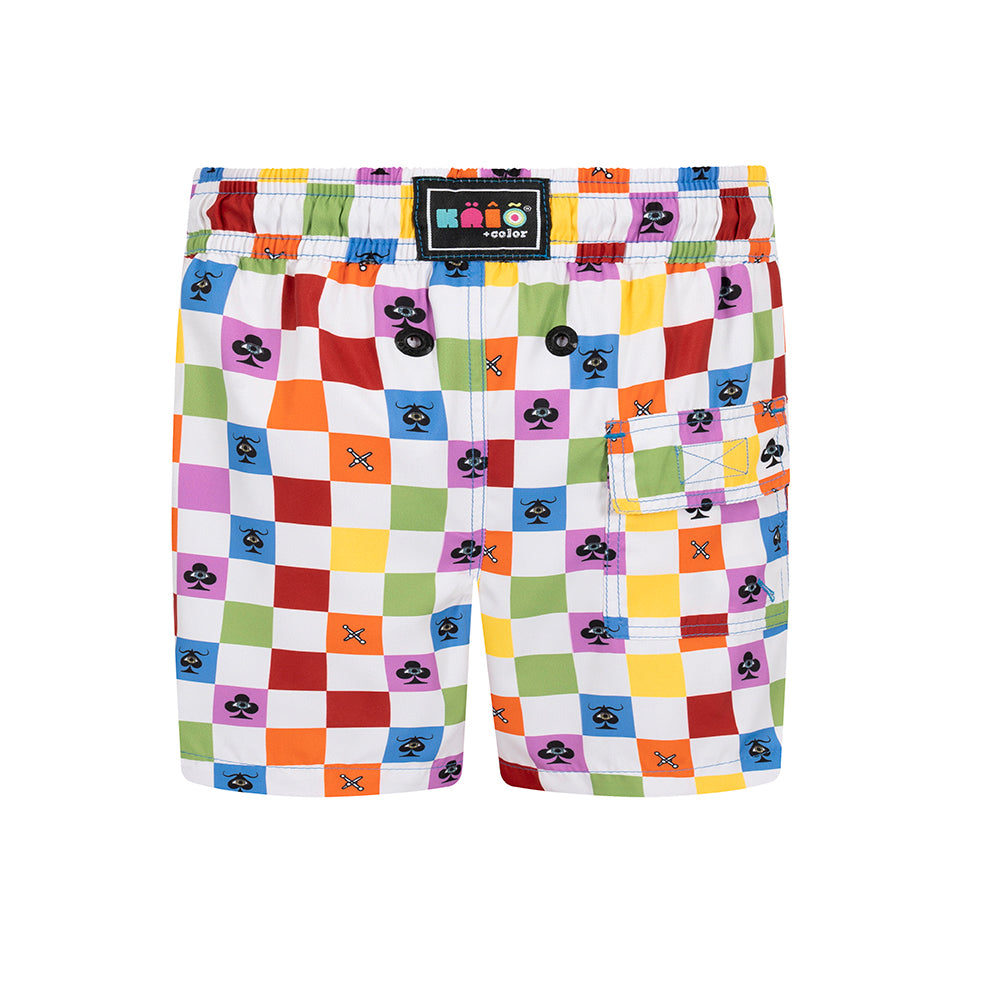 The Spades Kids' Swim Trunks are fun, perfectly fitted, and designed for comfort and protection. Made with smart fabric featuring UPF 50+ sun protection, these trunks include an elastic waistband, adjustable drawstring, mesh lining, side pockets, and a contrasting back pocket with an adjustable cord. They dry quickly, have rear ventilation eyelets, and are crafted from 100% recycled polyester.