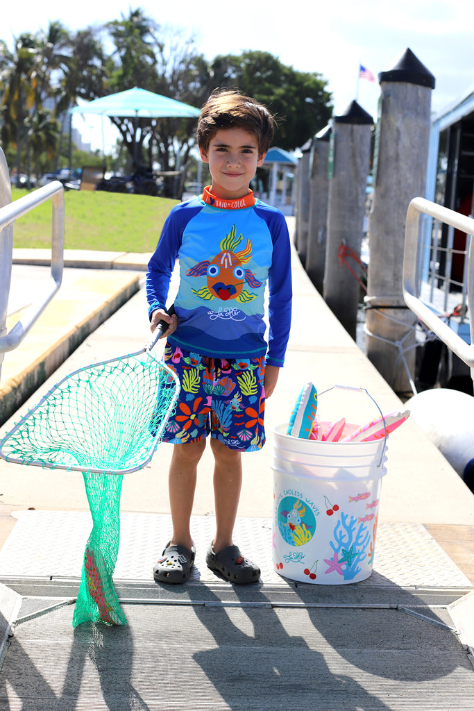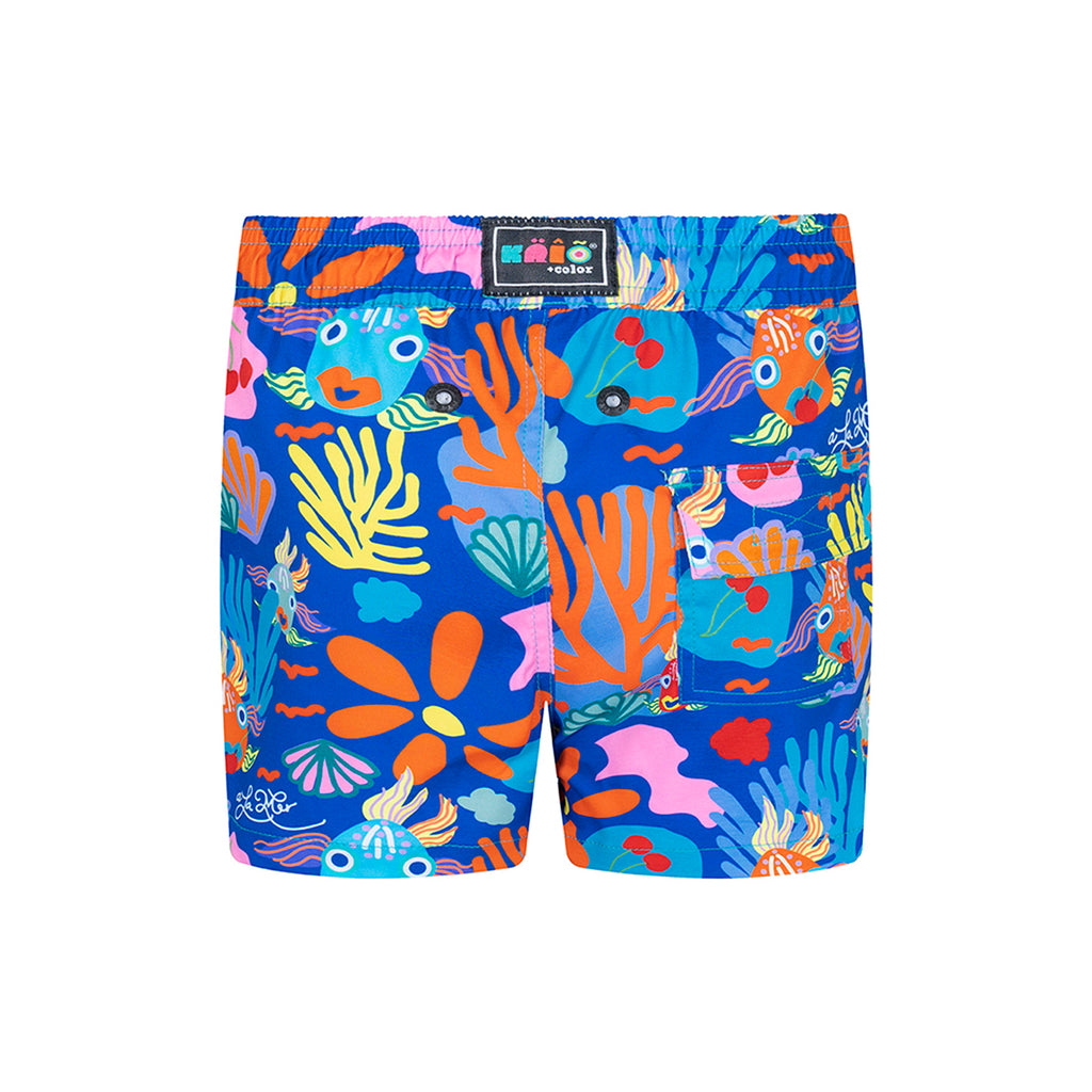 Our Sparkling Fish boys' shorts are fun and fit perfectly. They are made with smart fabric with PFS 50+ protection. Featuring an elastic waistband, adjustable drawstring, internal mesh lining, side pockets, and a contrasting back pocket with a drawstring. They are quick-drying, with rear ventilation eyelets, PFS 50+ sun protection, and 100% recycled polyester.