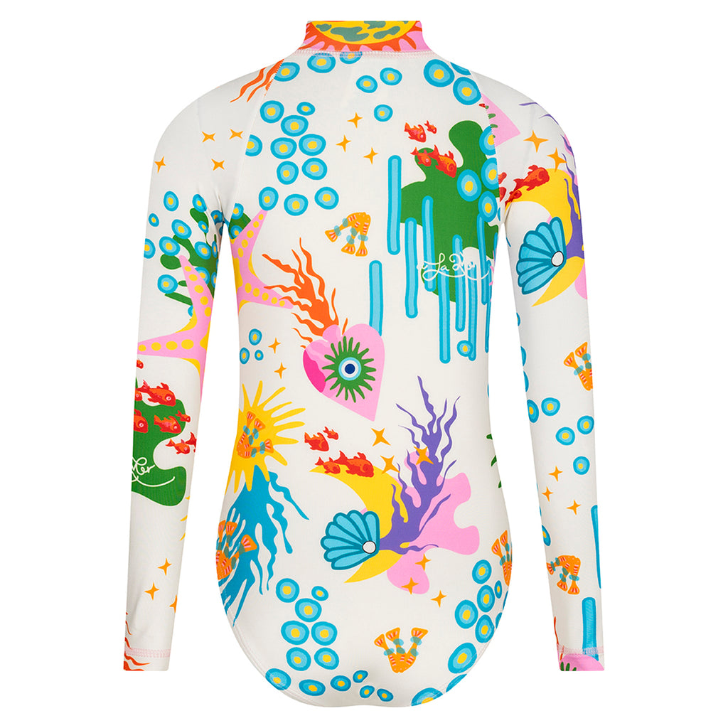 Our new long-sleeve one-piece swimsuit "Pélican Marin" is perfect for active and fashionable girls. These UV-protected swimsuits are made from soft, recycled polyester fabric that dries easily and offers UPF 50+ sun protection. This one-piece swimsuit is perfect for sunny days, swimming, snorkeling, and paddleboarding. Designed for all-day wear at the beach, this girls' swimsuit for surfing with fish and coral contrasts with a front zipper.