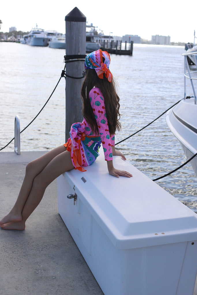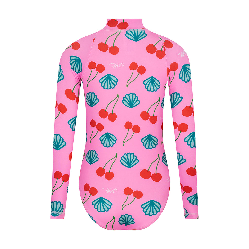 Our new long-sleeve one-piece swimsuit "Mon Cheri" is perfect for active and fashionable girls. These UV-protected swimsuits are made from soft, recycled polyester fabric that dries easily and offers UPF 50+ sun protection. This one-piece swimsuit is perfect for sunny days, swimming, snorkeling, and paddleboarding. Designed for all-day wear at the beach, this girls' swimsuit for surfing with fish and coral contrasts with a front zipper.